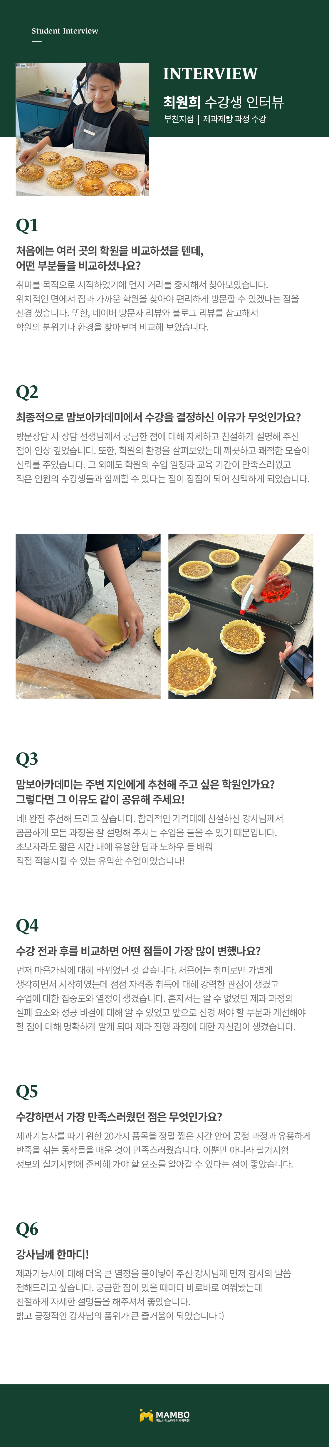 제1조 (개인정보 수집에 대한 동의)맘보교육그룹(이하 회사)는 이용자들이 회사의 개인정보취급방침 또는 이용약관의 내용에 대하여 “동의”버튼 또는 “취소”버튼을 클릭할 수 있는 절차를 마련하여, “동의”버튼을 클릭하면 개인정보 수집에 대해 동의한 것으로 봅니다. 제2조 (개인정보 수집항목) 온라인 문의를 통한 상담을 위해 처리하는 개인정보 항목은 아래와 같습니다. 수집항목 : 성명, 이메일, 전화번호 제3조 (개인정보의 이용목적) 회사는 이용자의 사전 동의 없이는 이용자의 개인 정보를 공개하지 않으며, 원활한 고객상담, 각종 서비스의 제공을 위해 아래와 같이 개인정보를 수집하고 있습니다. 모든 정보는 상기 목적에 필요한 용도 이외로는 사용되지 않으며 수집 정보의 범위나 사용 목적, 용도가 변경될 시에는 반드시 사전 동의를 구할 것입니다. - 성명 : 제품상담에 따른 본인 확인 - 이메일, 전화번호 : 제품상담 및 이벤트 관련 고지사항 전달, 새로운 서비스 및 신상품 정보 제공(DM, SMS, 이메일 등 이용) 이용자는 개인정보의 수집/이용에 대한 동의를 거부할 수 있습니다. 다만, 동의를 거부하는 경우 온라인 문의를 통한 상담은 불가하며 서비스 이용 및 혜택 제공에 제한을 받을 수 있습니다. 제4조 (개인정보의 보유 및 이용기간) 원칙적으로 개인정보 수집 및 이용목적이 달성된 후에는 해당 정보를 지체 없이 파기합니다. 그리고 상법, 전자상거래 등에서의 소비자보호에 관한 법률 등 관계법렵의 규정에 의하여 보존할 필요가 있는 경우 회사는 관계법령에서 정한 일정한 기간 동안 정보를 보관합니다. 이 경우 회사는 보관하는 정보를 그 보관의 목적으로만 이용하며 보존기간은 아래와 같습니다. - 계약 또는 청약철회 등에 관한 기록 : 5년(전자상거래등에서의 소비자보호에 관한 법률) - 소비자의 불만 또는 분쟁처리에 관한 기록 : 3년(전자상거래등에서의 소비자 보호에 관한 법률) - 시용정보의 수집/처리 및 이용 등에 관한 기록 : 3년(신용정보의 이용 및 보호에 관한 법률) - 회사는 귀중한 이용자의 개인정보를 안전하게 처리하며, 유출의 방지를 위하여 다음과 같은 방법을 통하여 개인정보를 파기합니다. - 종이에 출력된 개인정보는 분쇄기로 분쇄하거나 소각을 통하여 파기합니다. - 전자적 파일 형태로 저장된 개인정보는 기록을 재생할 수 없는 기술적 방법을 사용하여 삭제합니다.